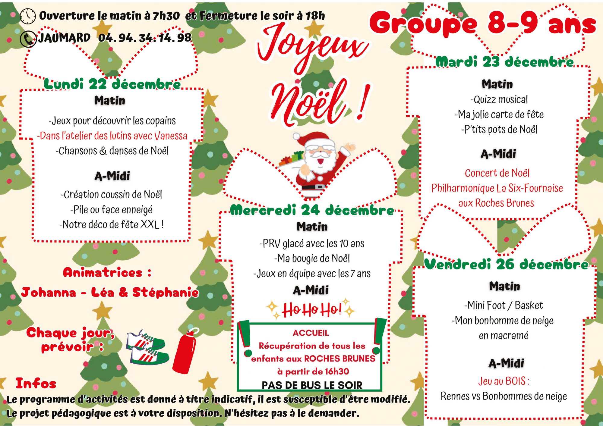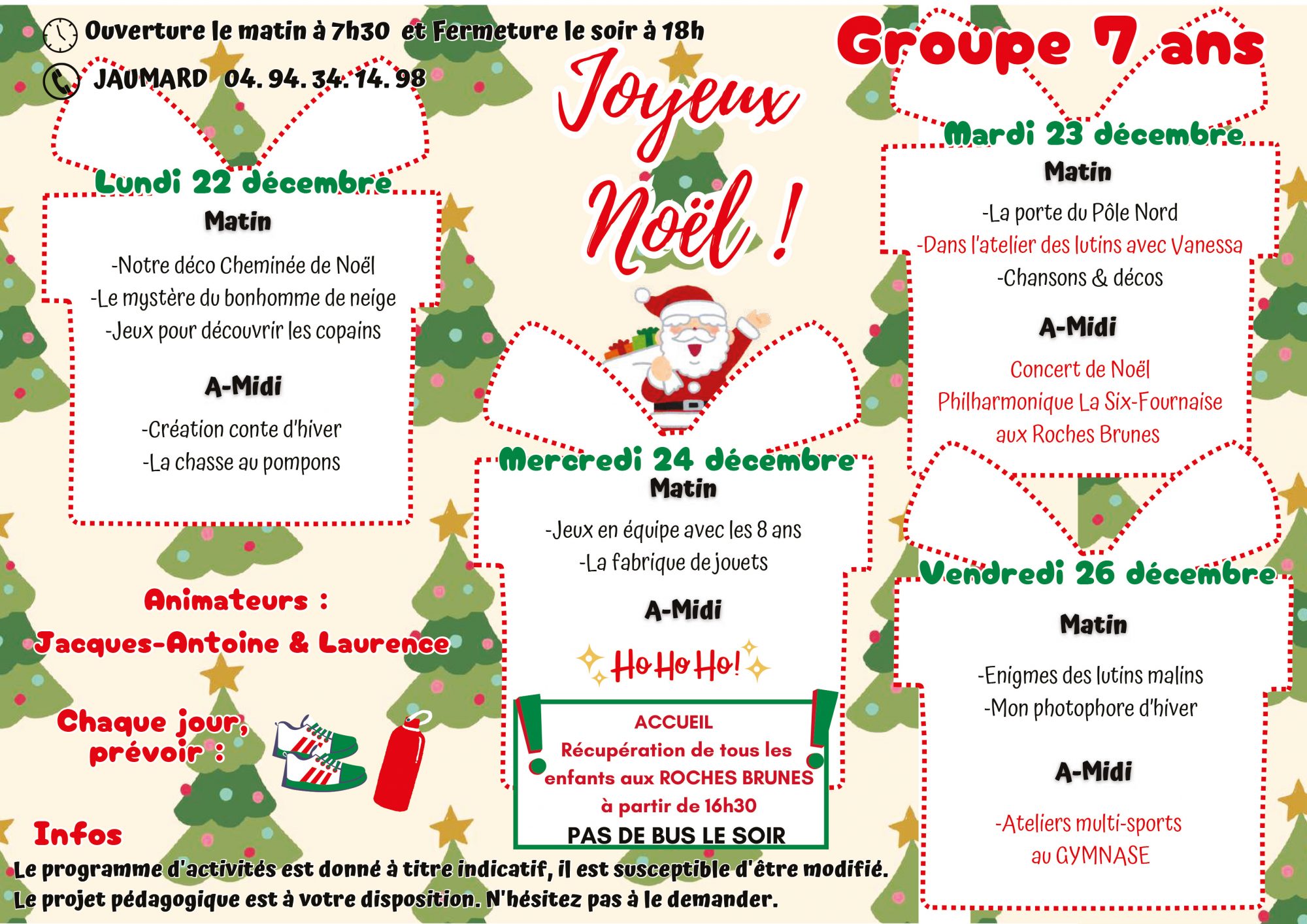 Les enfants inscrits aux centre de loisirs sont répartis par groupes d’âges et sont encadrés par des animateurs municipaux qualifiés. Un planning d’activités leur est remis en début de séjour, composé d’activités manuelles, sportives, ludiques, de sorties, de visites ou encore de pique-niques sur les beaux jours. L’accueil de l’enfant s’effectue en journée complète. Les familles ont la possibilité d’accompagner leur enfant sur le centre des « Roches Brunes » et « Jaumard » entre 7h30 et 9h et de le récupérer entre 17h et 18h.
