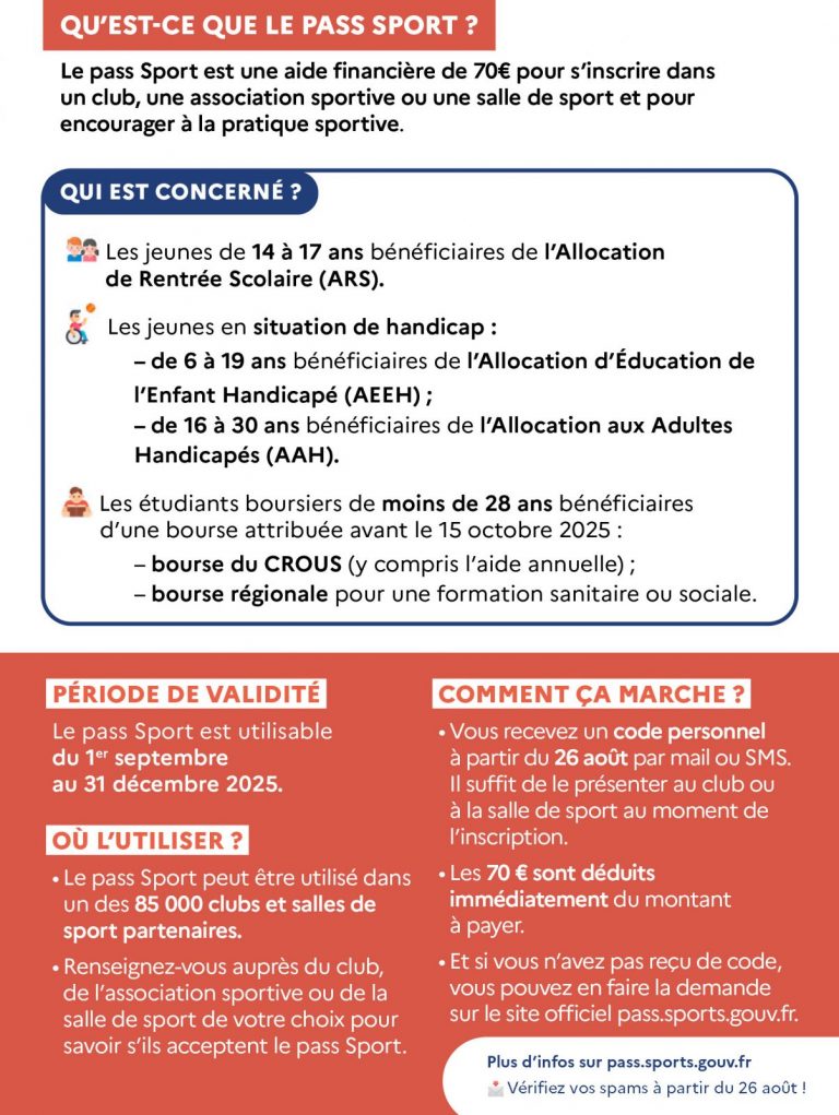 Le Pass’Sport est une allocation de rentrée sportive de 70 euros par enfant/jeune adulte pour financer tout ou partie de son inscription dans un club sportif volontaire et lui permettre de participer aux activités qu’elle organise au titre de la saison 2025-2026. Le ministère des Sports et des Jeux Olympiques et Paralympiques
